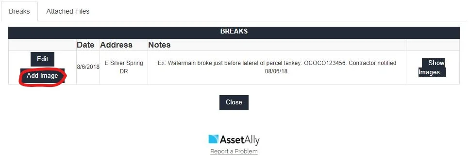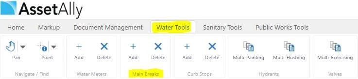 The Water Main Break Tool gives you the ability to locate and record water main breaks quickly and efficiently - allowing better visualization of water pipe conditions. This tool is located under the “Water Tools” tab in your AssetAlly application.